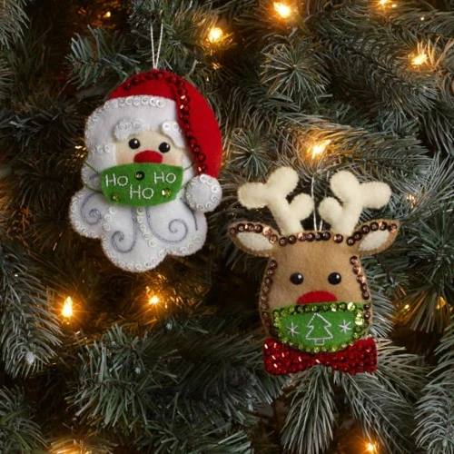 Mask up! Even your ornaments are staying safe this holiday with colorful and festive masks. Trim your tree this holiday season with felt ornament sets from Bucilla. Makes two ornaments. This package contains stamped felt, cotton embroidery floss, color-separated sequins and beads, two needles, and instructions.