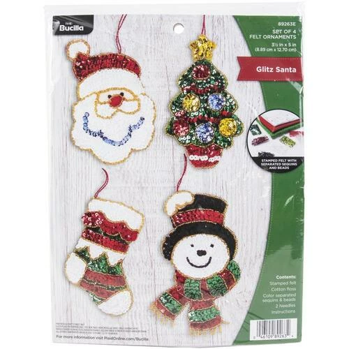 Decorate your Christmas tree or complete your holiday home decor with the delightful ornaments of the Glitz Santa’ felt applique ornament kit from Bucilla.