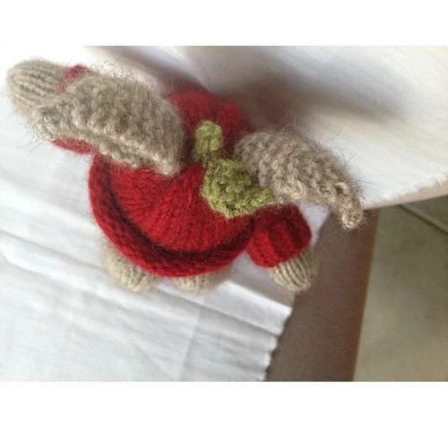Apple Bunny is 24 cm tall and knitted in possum and merino yarn DK/8ply yarn and 3mm needles to give and extra soft and cuddly toy. The jumper has a wee pocket embellished with an apple button (included) and a hat to match.