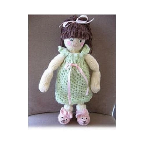 Clothes included in the pattern are: knickers, socks, shoes, dress, cardigan, nightdress and bunny slippers. The body and hair are made from 8 ply/double knitting yarn and the clothing is made from 4 ply yarn. Penny is 32cm high.