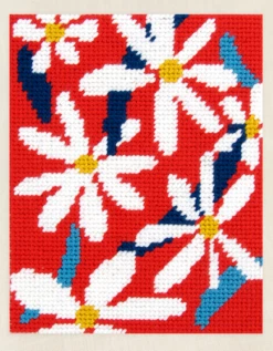 The bright white of these daisies really pop against the vibrant reds and blues in the rest of this design by Bethan Haf Jones. Frame it and hang it on your wall as a statement piece. This kit comes complete with DMC Soft Cotton, a matte effect thread that gives tapestry a more modern feel. The canvas is pre-printed so you can relax into this rhythmic technique straight away. The kit contains everything you need to complete the project including clear instructions.