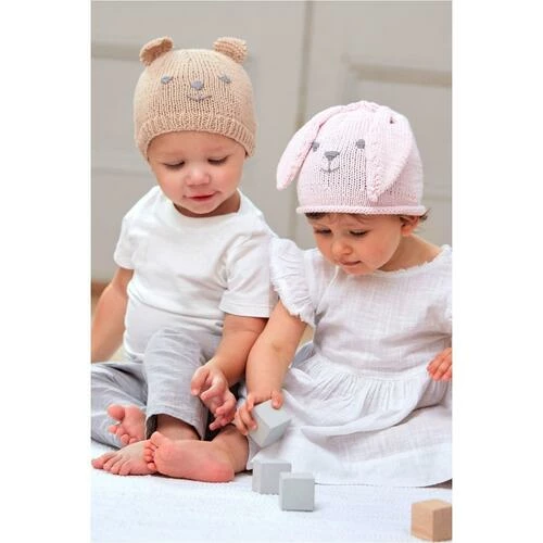 Styled for DMC’s 100% Baby Cotton, this pattern offers a choice of either a cute rabbit or teddy bear hat with stand-up or floppy knitted ears that will delight any young baby or child.
