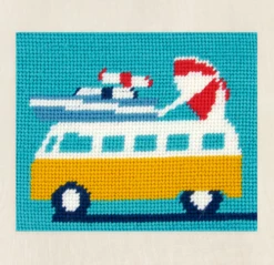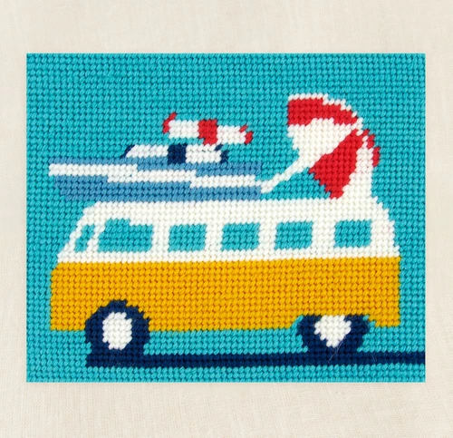 This cheery campervan is laden with beach equipment all ready for a holiday at the seaside. This kit by Joanna Hateley comes complete with DMC Soft Cotton, a matte effect thread that gives tapestry a more modern feel.