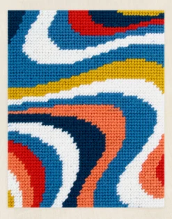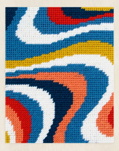 Stitch Bethan Haf Jones’ geometric waves in bright colors of DMC Soft Cotton, a matte effect thread that gives tapestry a more modern feel. The canvas is pre-printed so you can relax into this rhythmic technique straight away.