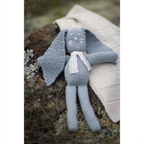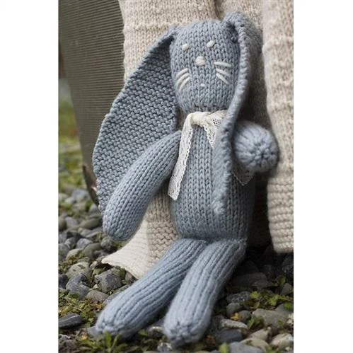 A fun knit toy rabbit, embroidered face and garter stitch ears.