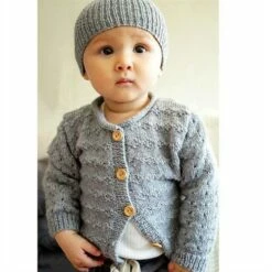 A textured cardigan with a rolled neck finish. Eyelets decorate the sleeves to add interest, teamed with a K1, P1 rib beanie. Written instructions for a boy and a girl, with a chart for the diamond textured pattern.