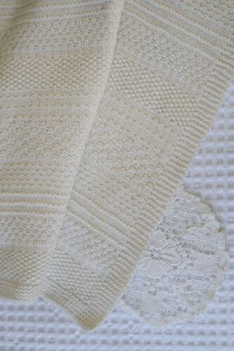 A textured knitted blanket with garter stitch edging. The repeating knit and purl textures create this interesting simple stripe pattern.