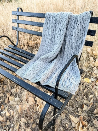 Cinda Block Blanket, a geometric knit and purl reversible blanket with eyelet details.