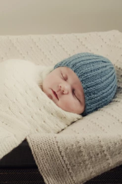 A ribbed beanie with matching ribbed booties, a simple knit and purl rib pattern to keep little baby warm.