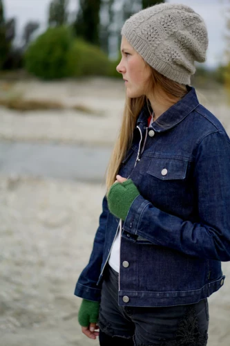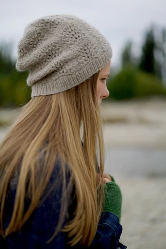 A slouchy hat with panels of lace and garter stitch with simple fingerless gloves.