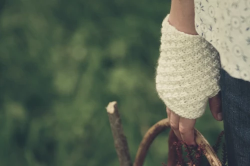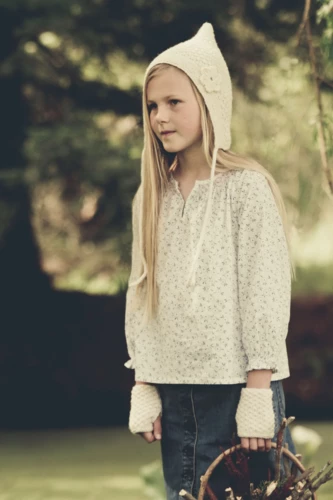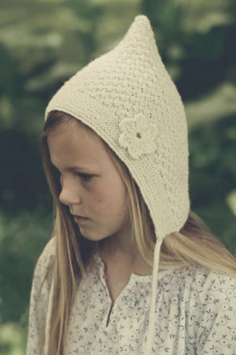 An easy knit textured pixie hat with i-cord and floral details and cute mitts. Great for those adventures along a garden path to pick the rambling flowers.