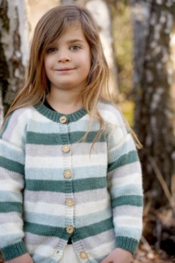 A four colour bold stripe cardigan knit up in 8ply, with drop shoulder sleeves, knit as you go front bands and rib crew neck.