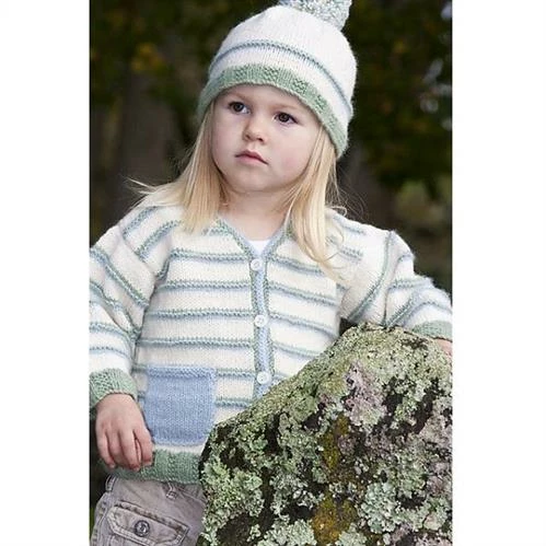 A lovely V neck knitted striped cardigan with patch pockets and a matching hat.