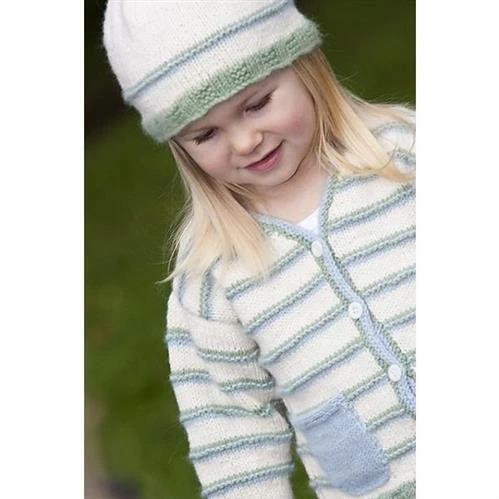 A lovely V neck knitted striped cardigan with patch pockets and a matching hat.