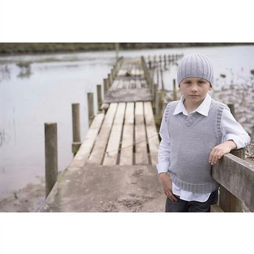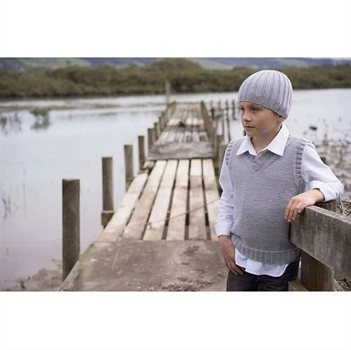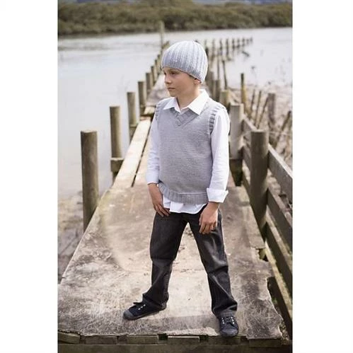 A boys V-neck vest and a matching ribbed beanie, a perfect layer for a busy boy.