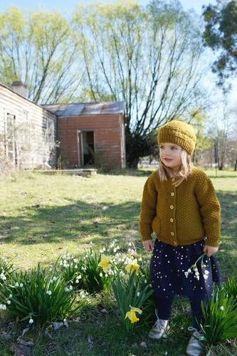 A textured cardigan featuring a garter stitch pocket and wide rib band. Knitted in 8ply merino teamed up with a patterned beanie. Written instructions for a boy and a girl.