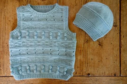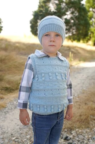 A multi textured vest with a matching hat, a fun project to knit with simple textures, bobbles and eyelets.
