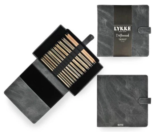 Lykke Driftwood 10″ Straight Single-pointed Knitting Needle Set enclosed in a grey denim case.