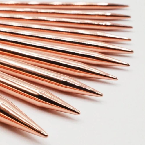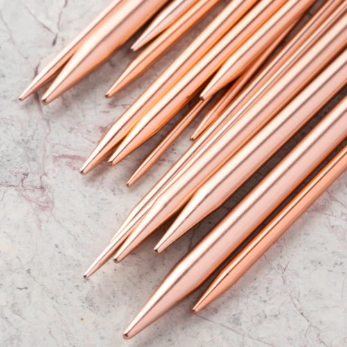 LYKKE Cypra 9cm (7 cm needle and approx. 2 cm metal part of cord) Interchangeable Needle Set from copper. The copper needles are untreated to enable them to develop a beautiful patina of iridescent oranges, purples, and greens, or you can restore the gleaming copper sheen using the LYKKE Cypra Polishing Cloth (sold separately).