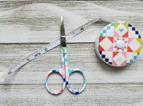 The Riley Blake Designs Scissor and Tape Measure Duo includes a embroidery scissors and matching tape measure with a cute, patchwork quilt design. The scissors are 3.25in and the tape measures to 60 inches.