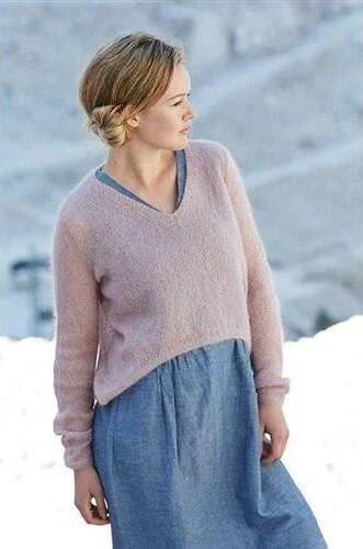 Knit this women’s stocking stitch cropped sweater from the Simple Shapes Kidsilk Haze Collection, a design by Marie Wallin using the gorgeous yarn Kidsilk Haze (mohair and silk). With V neck, longer back hem and full length set-in sleeves, this knitting pattern has a two star difficulty rating.