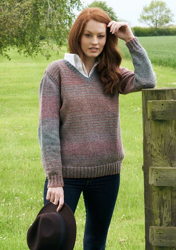 A simple v-neck sweater, designed by Lisa Richardson, is given a colourful twist by using two balls of yarn at once and working two rows alternately from each ball throughout. The sweater is finished with rib details at the neck, cuffs and hem and also features long sleeves.