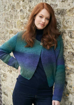 This textured moss stitch cardigan, designed by Kim Hargreaves, uses just one shade of the beautiful Felted Tweed Colour. Featuring a single button fastening at the collar, the shaping is unique in that the left front is intentionally longer than the back and the right front is intentionally shorter to achieve a thrown-together asymmetric finish to the garment once buttoned.
