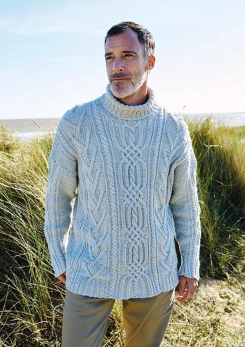 Knit this mens gansey sweater from Ocean Blue, a design by Martin Storey using our versatile yarn originally sourced from recycled denim, Denim Revive (cotton and other fibers.) With all over cables and deep rib roll neck, this pattern is suitable for more advanced knitters.
