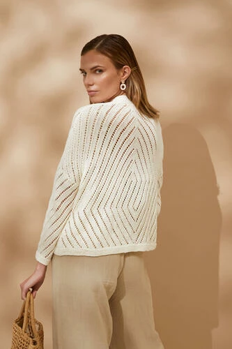 Designed by Georgia Farrell, this women’s cardigan features a cropped waistline and 3/4 length drop-shoulder sleeves. The design also features an all-over eyelet lace pattern in reversing diagonal lines and a wide garter stitch border. Summerlite 4 ply is used for a beautifully cool finished fabric.