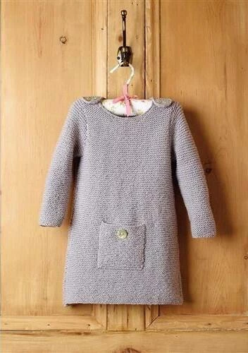 Long sleeved, round neck dress with button tab closure on both shoulders in garter stitch