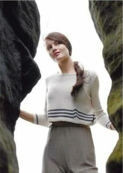 This neat sweater has three quarter length sleeves and a contrasting stripe design and the pattern is suitable for the more experienced knitter.