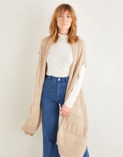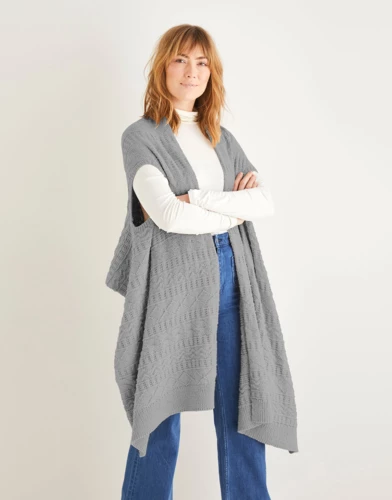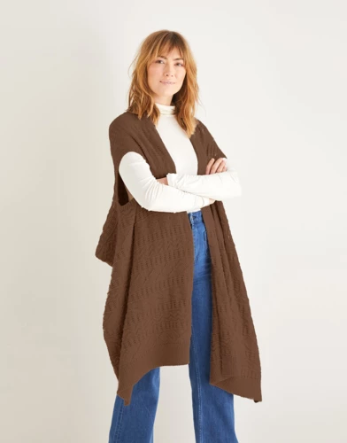 With more than a little pioneer spirit and inspired by native American patterns and textures, our Blanket Style Wrap is knitted in one piece, with armholes integrated within the seamless panel.