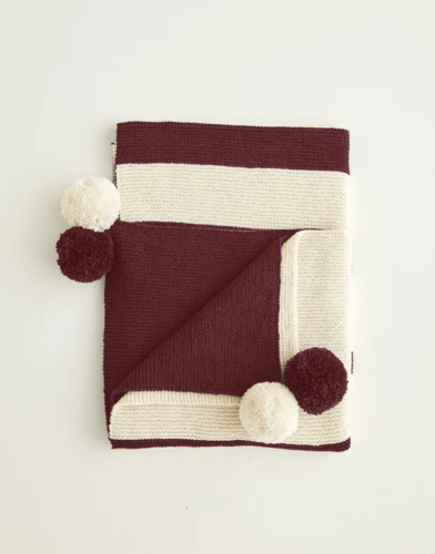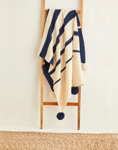 Inspired by traditional Moroccan hammam towels, the graphic graduated stripes of this two-colour blanket will make a striking addition to any contemporary home. Finished with tactile pom poms at the corners, this simple blanket is a fantastic, fun first knit to be proud of. Knitting level: Beginner You will also need: 1 pair of 4.5mm (UK7 – USA7) Knitting Needles.