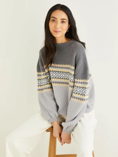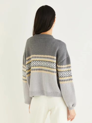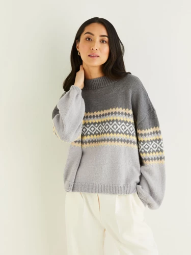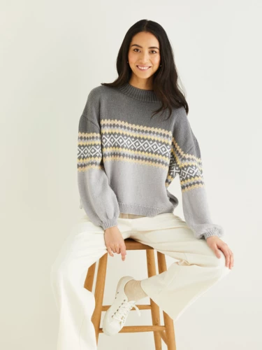 In cool contemporary shades, our designers have created a more Modern Fair Isle knit by placing the pattern straight across the body and sleeves of this sweater. The sleeves have extra volume, pulled in by a small ribbed cuff, to create an on-trend feminine silhouette.