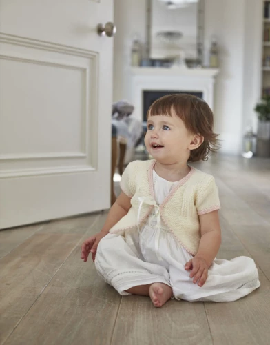 Knit this stunning bolero style cardigan with a delicate picot edging and a round neck or V neck. The pattern also comes with the option of long-sleeves or short sleeves, all knitted in our super-soft Sirdar Snuggly 100% Merino. Detailed with set-in sleeves this soft, machine-washable cardigan can be made in sizes newborn to three years.
