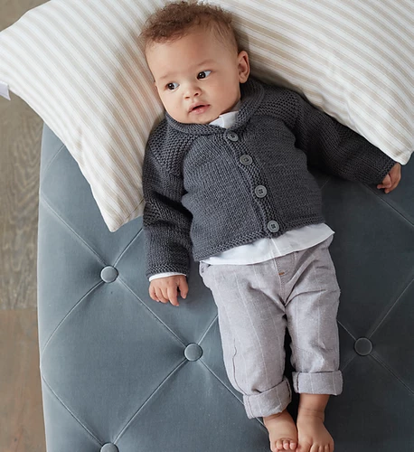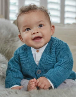 This V neck cardigan is knitted in Sirdar Snuggly Cashmere Merino, available in a wide range of colours. The cute garter stitch elbow patches and trims are a fun contrast against the stocking stitch body. With the option of a shawl collar or rib trim you’ll want to knit this pattern over and over so we’ve included instructions for babies from newborn to three years.