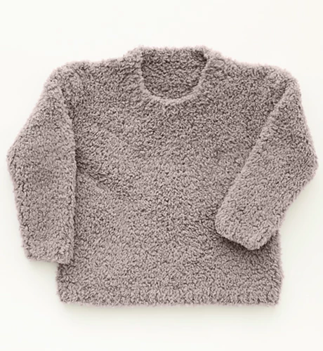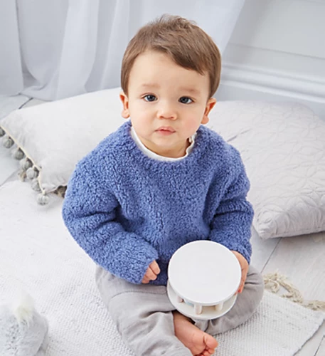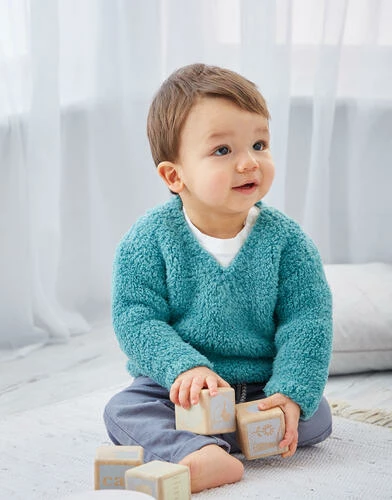 A classic style sweater is given a new cosy twist with Sirdar Snuggly Bunny. Knit this round or V-neck sweater for a little one aged from newborn to two years.