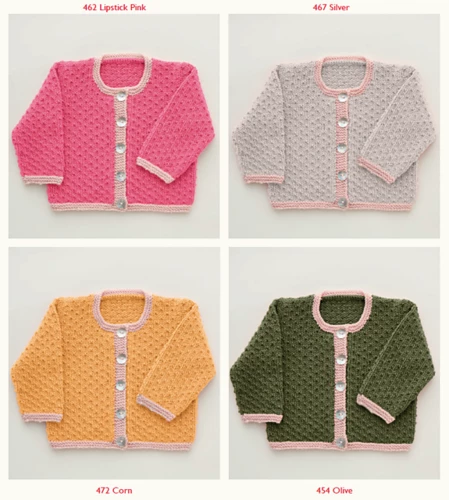 This round neck cardigan is knitted in Sirdar Snuggly Cashmere Merino, which gives it such excellent stitch definition. It is knitted in stocking stitch, with decorative purl stitches throughout, and contrast garter stitch trims. The pattern includes instructions for ages from newborn to three years.