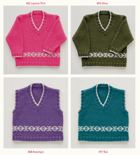 Take your pick from this V-neck sweater or vest. Both designs have contrasting edging at the ribbing and stranded colourwork detail. Both styles are created in Sirdar Snuggly Cashmere Merino yarn for a super-soft feel and easy-care practicality and can be made for ages from newborn to three years.