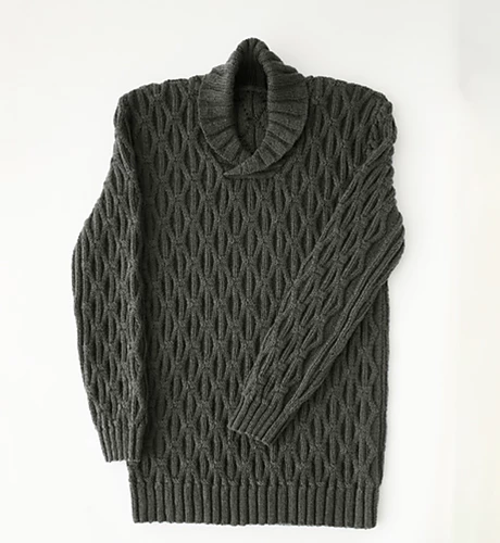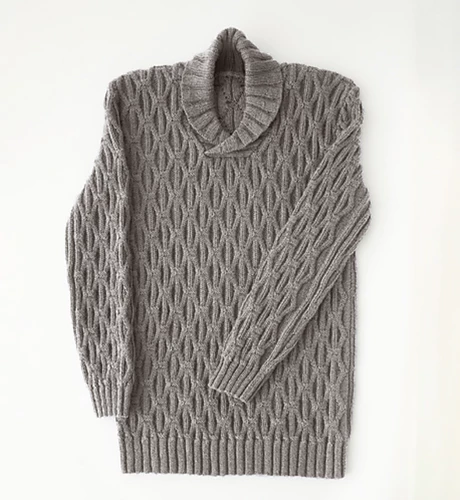 With all over cables, this shawl collared sweater has a geometric feel. Knitted in Sirdar Country Classic, this soft, cosy sweater can be made in sizes S to XXXL.