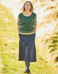 A modern take on a timeless pattern, this cool pattern sleeve sweater is a fun way to wear Fair Isle. With subtle fair isle sleeves and hem, this round neck sweater with flattering half sleeves is a perfect spring/summer staple as the weather starts to heat up.