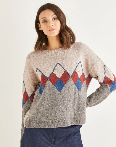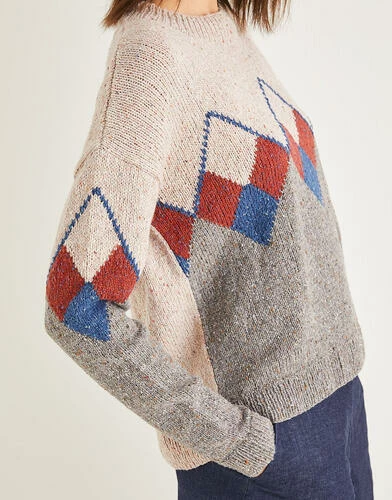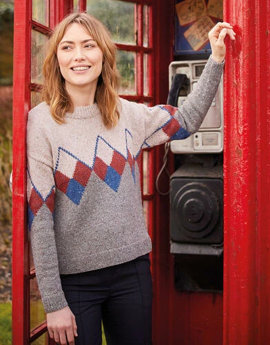 Elevate your wardrobe this season with this classic British Intarsia Argyll sweater in Sirdar Haworth Tweed. The tweedy preppy Argyll pattern has been swiss darned. Featuring a crew neck and dropped sleeves for added cosiness.