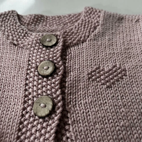 A relaxed fit drop sleeve cardigan with seed stitch bands and optional heart motif front and back