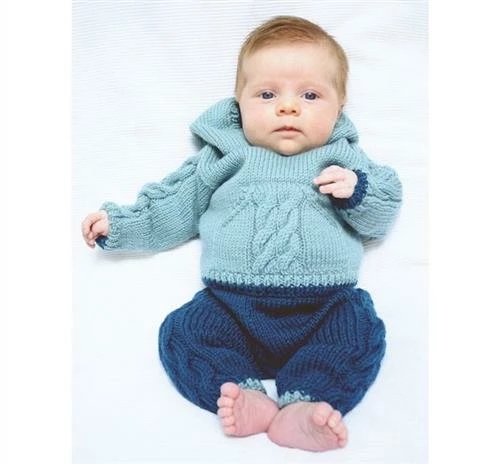 3.25mm/US 3/UK 10 and 4mm/ US 6/UK 8 needles, cable needle, stitch holders, elastic for pants.